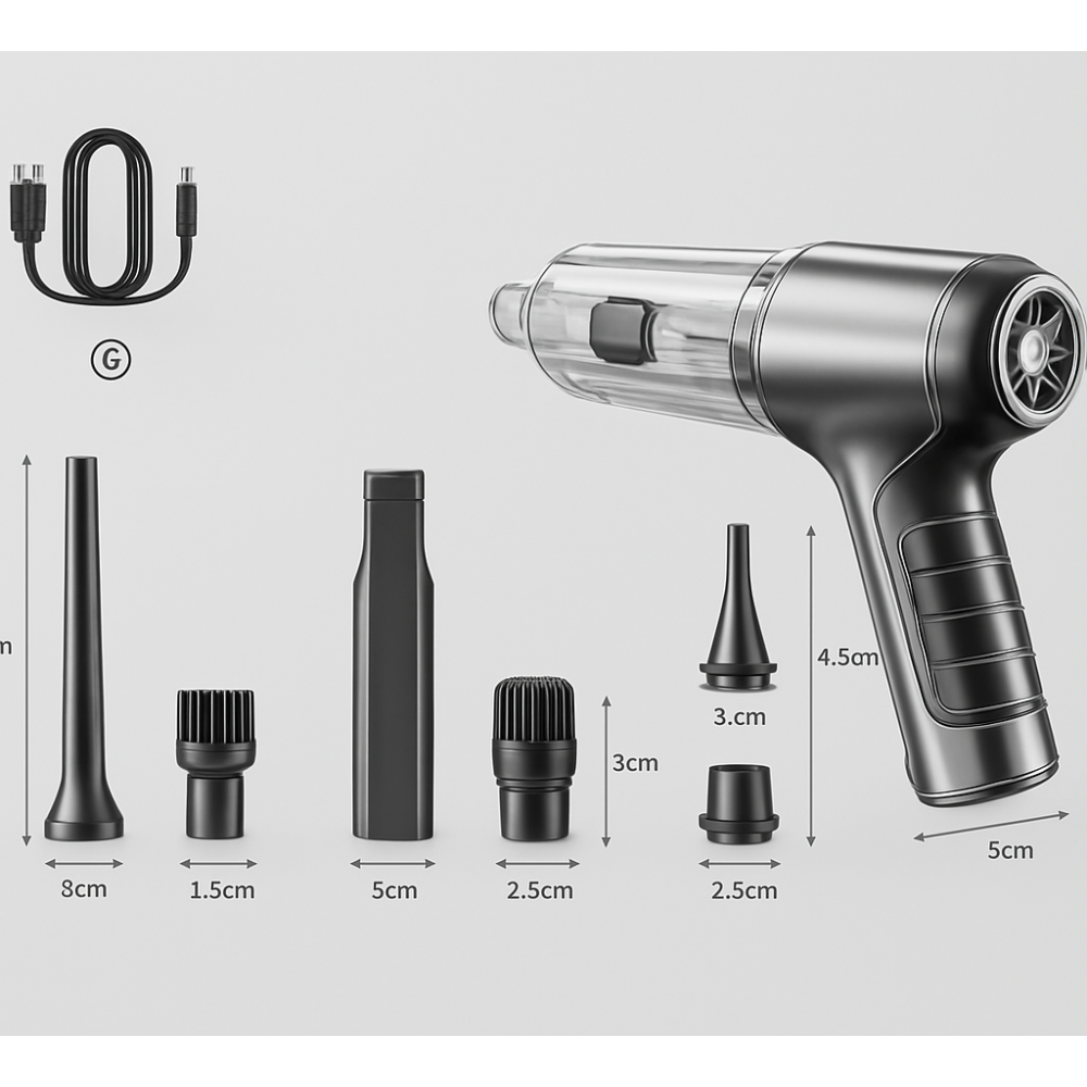 Elimina pelos de mascota, polvo y suciedad en coche, sofá y cualquier rincón en segundos. Versión Pro actualizada [Color]: Plateado [Material del producto]: ABS [Motor]: Nuevo motor sin escobillas mejorado [Potencia de aspiración]: 50000 PA/95000 PA [Velocidad nominal]: 35500 rpm [Capacidad de la batería de litio]: 2 x 2000 mAh [Modo de carga]: Cable de carga USB de 5 V [Potencia nominal]: 120 W [Ruido]: ≤ 52 dB [Temperatura de funcionamiento]: -20 °C a +50 °C] [Peso]: 550 g Versión básica [Color]: Gris [Material del producto]: ABS [Motor]: Motor convencional [Nivel de aspiración]: 15000 PA [Velocidad nominal]: 15500 rpm [Capacidad de la batería de litio]: 2 x 2000 mAh [Modo de carga]: Cable de carga USB de 5 V [Potencia nominal]: 120 W [Ruido]: ≤ 52 dB [Temperatura de funcionamiento]: -20 °C a +50 °C [Peso]: 520 g Nota: 1. Esta aspiradora utiliza un chip inteligente con función de bloqueo para niños. El interruptor no se abrirá al tocarlo para evitar que los niños lo toquen accidentalmente. 2. Modo de inicio normal: mantenga pulsado el interruptor durante 3 segundos y luego enciéndalo. Al soltarlo, el modo es normal, menos ruidoso y adecuado para limpiar pequeñas áreas con polvo. 3. Modo Super: Mantenga pulsado el interruptor durante 3 segundos, suéltelo y vuelva a pulsarlo para acceder al modo Super. Notará claramente el aumento de succión, ideal para limpiar a fondo las grietas y el polvo. (Este modo solo es compatible con la versión PRO de la aspiradora).